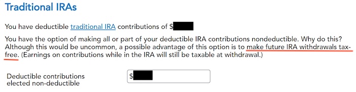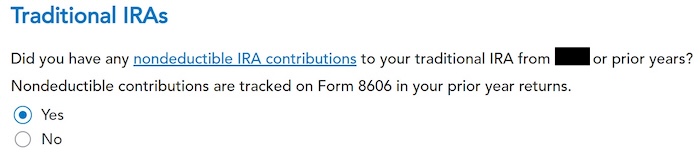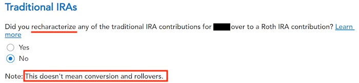 When you contribute for the previous year and convert (or recharacterize and convert in the following year), you have to report them on your tax return in two different years: the contribution in one year and the conversion in the following year. It’s more confusing than a straight “clean” backdoor Roth, but that’s the price you pay for not knowing the right way. This post shows you how to report the contribution part in TurboTax for the first year. The follow-up post, Split-Year Backdoor Roth IRA in TurboTax, Year 2, shows you how to report the conversion part in TurboTax for the second year.