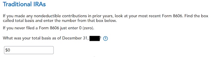 If you used TurboTax correctly last year, it tracks your basis and puts the correct number here. This is normally zero if you contributed to a Traditional IRA for the first time. If you put in a number because you didn’t understand what it was asking, you can correct it now.