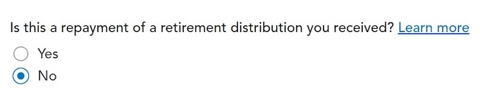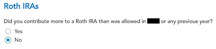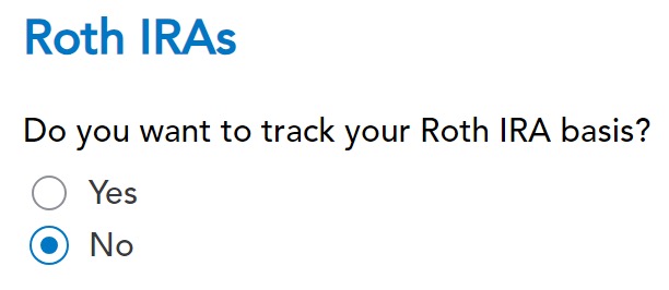 If you want TurboTax to track your Roth IRA basis, it will ask you a series of questions about your history, which is more trouble than it’s worth to me. I answered No. You don’t need to track your Roth IRA basis if you’re planning to withdraw from your Roth account only after age 59-1/2 and after you’ve had your first Roth IRA for five years. See Roth IRA Withdrawal After 59-1/2 in TurboTax.