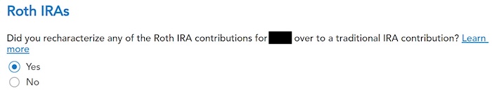 Now we confess that we recharacterized the contribution as a Traditional IRA contribution. Answer Yes here.