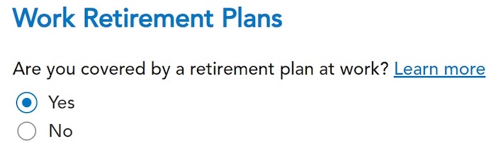 You may not get this question if TurboTax sees that you’re covered by a workplace retirement plan from Box 13 in your W-2. Answer yes if you’re covered by a retirement plan but the box on your W-2 wasn’t checked.