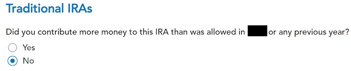 You can answer “No” if this is the first time you contributed to a Traditional IRA, but answering “Yes” with a 0 has the same effect, and it allows you to correct errors.