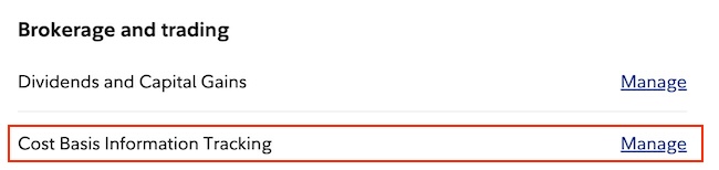 Find Cost Basis Information Tracking in the Brokerage and Trading section. Click on Manage.