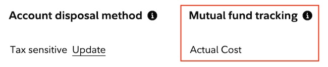 Fidelity displays two columns. If the Mutual fund tracking column shows Actual Cost for your regular taxable account, that’s the setting you want. You should change it if it shows Average Cost. It’s OK to have Average Cost in a tax-advantaged account. Cost basis tracking doesn’t matter in a tax-advantaged account.