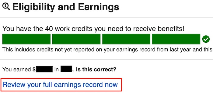 Click on “Review your full earnings record now.” Your earnings record provides the key to seeing where you are relative to the bending points and what your estimated benefits will be if you don’t work all the years until you claim Social Security. Use your mouse to highlight the entire table of your earnings history and copy all the data.