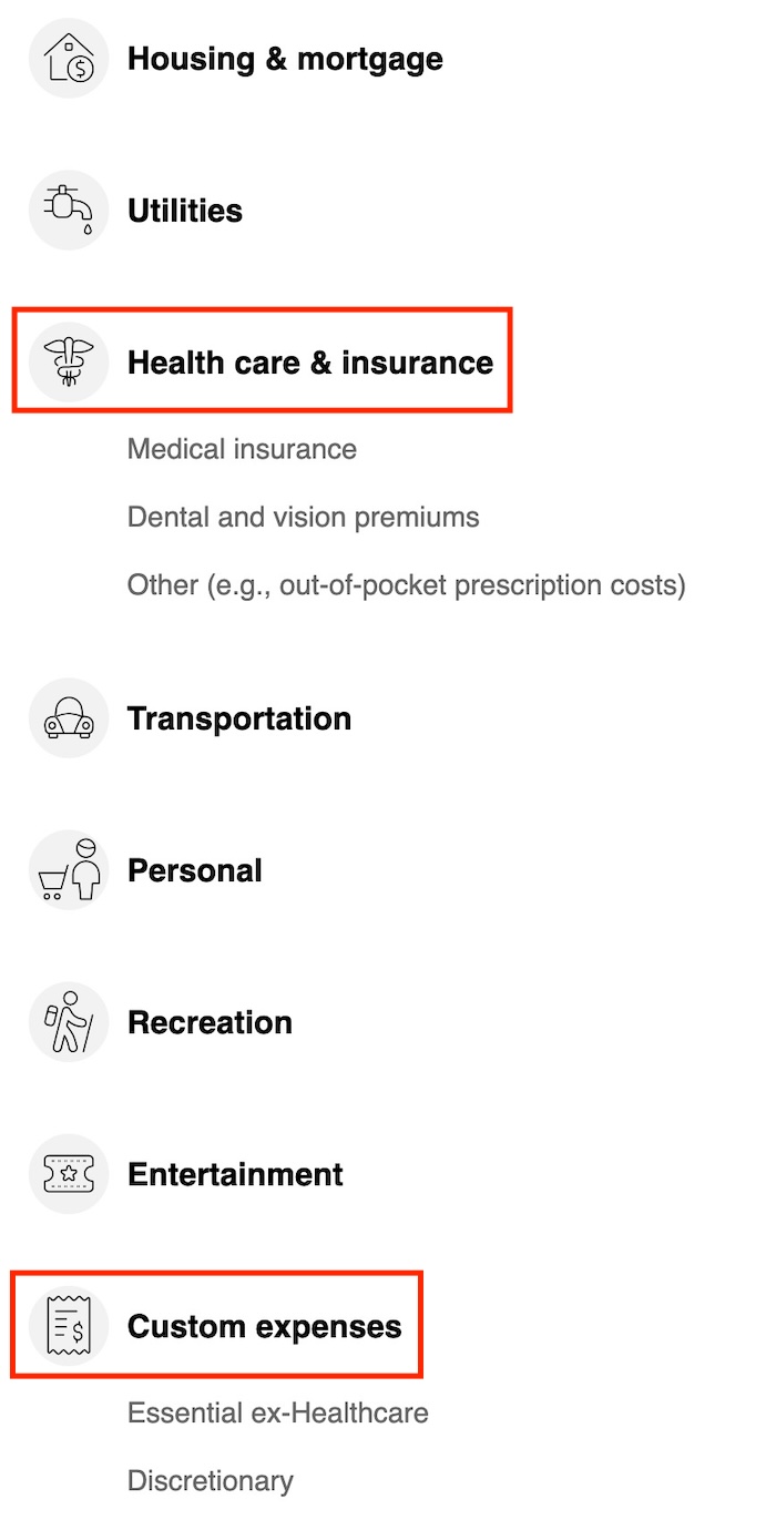 You still fill out the healthcare portion because the planning tool makes a higher inflation adjustment for healthcare expenses than for other expenses. I would enter only two custom expenses besides healthcare: Essentials ex-Healthcare and Discretionary Expenses. These are the base expenses that will last throughout retirement.