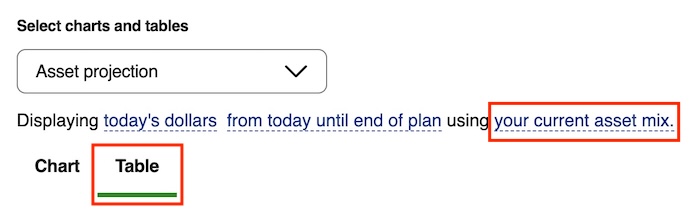 Click on “your current asset mix” above the asset projection chart or table.