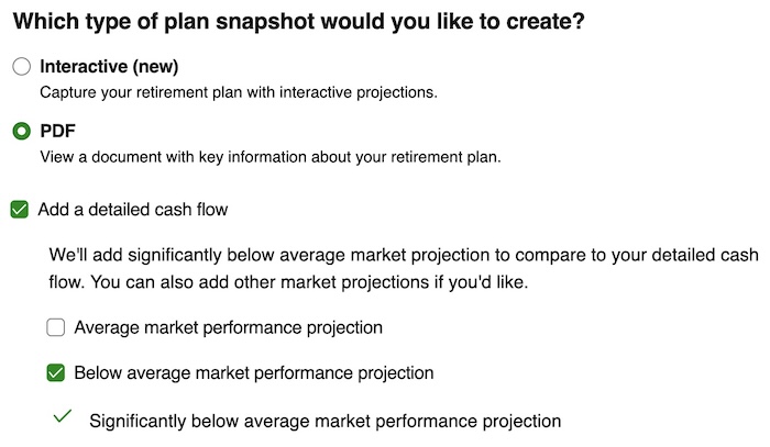 You should save a report now before you explore further. Scroll down to find the button to create a retirement plan snapshot. This serves as your baseline scenario.
