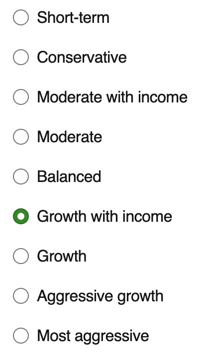 By default, the planning tool uses your actual asset allocation from the holdings in your accounts. You can also switch to one of nine model portfolio allocations, ranging from 100% short-term investments to 100% stocks.