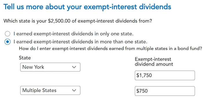Unless your tax-exempt dividends came from a state-specific fund that’s 100% tax-exempt in your state, choose “I earned exempt-interest dividends in more than one state” and break it down between your state and “Multiple States.” TurboTax will exempt the portion for your state on your state income tax return.